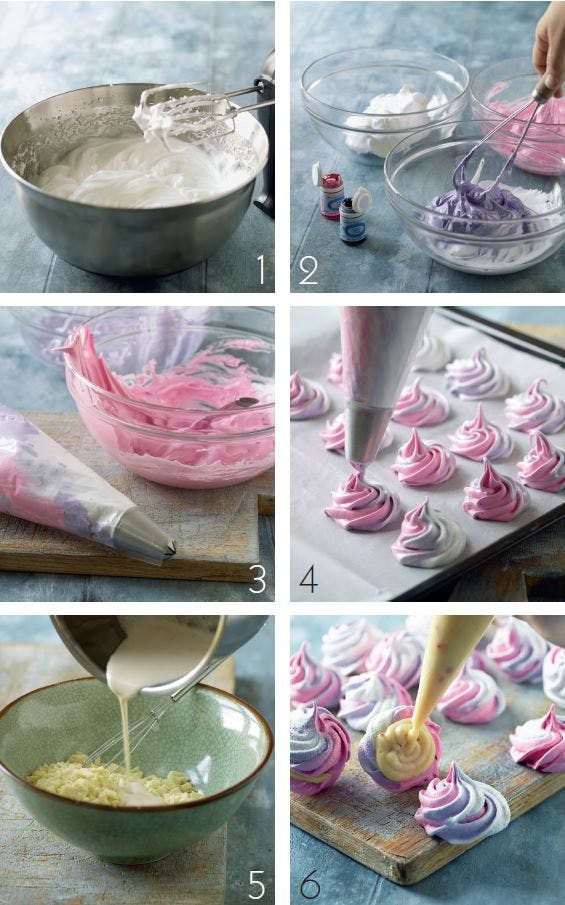 Fyld en sprøjtepose med tylle med de 3 slags farvet marengs. Fyld posen op lagvis, så du sprøjter alle tre farver ud, hver gang du laver en marengs.