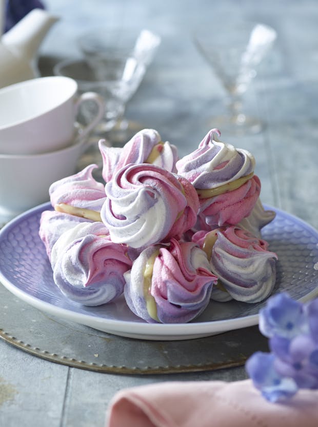 Sprøjt ganache på en marengsbund, og læg en anden marengs på. Fortsæt med de øvrige marengs. Servér de søde marengskager til en god kop sort te eller kaffe.