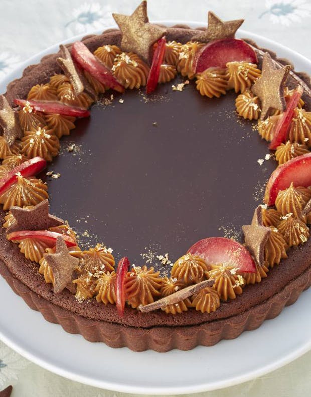 En cremet chokoladetærte er et velsmagende førstevalg, når det gælder dessertbordet til nytår. Denne flotte tærte med chokolade er fint pyntet med karameltoppe, blommer, mørdejsstjerner og guldstøv. Du kan sagtens lave den i god tid, så du undgår at komme i tidsnød nytårsaften!