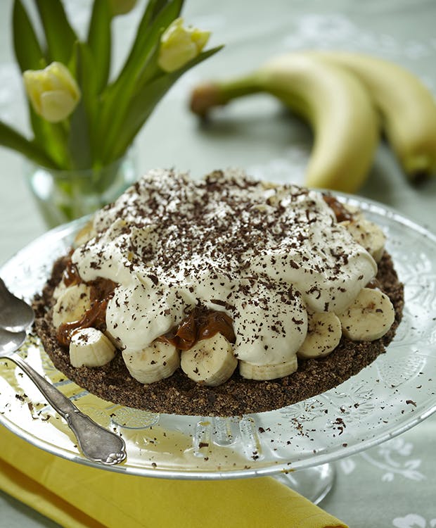 Tip: Du kan selv bestemme, hvordan du vil bygge din banoffee pie op. Du kan følge opskriften her og placere bananerne under karamellen, men du kan også putte din karamel direkte på kagebunden og lade den hvile i køleskabet til, den er størknet. Derefter kan du putte flødeskum på karamellaget efterfulgt af skiver af banan og til sidst slutte af med den hakkede chokolade.
