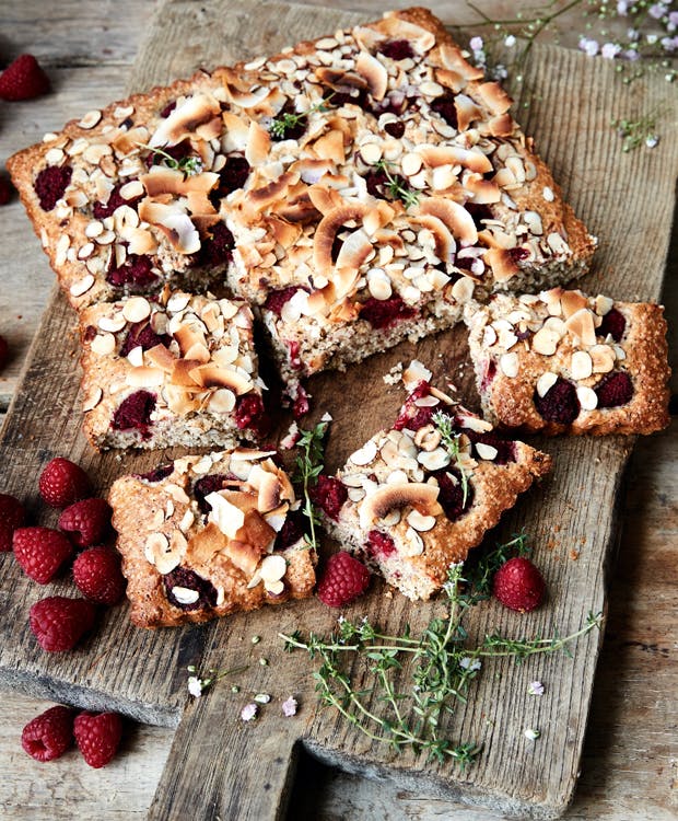 Har du hindbær i haven, er det oplagt at bruge de sødmefyldte bær i kager og desserter. I denne opskrift får de små sommerbær selskab af hasselnødder og kokosflager – og hvis du skal skrue en ekstra tand op for forkælelsen, kan du servere tærten med en kugle vaniljeis til.