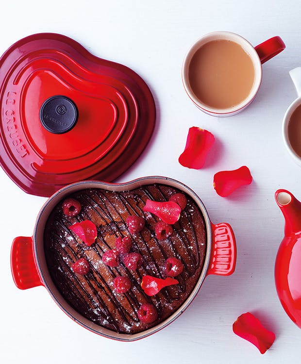 Gør denne valentinsdag ekstra sød og hyggelig for en, du har kær med denne skønne chokoladekage med hindbær og rosenblade. Udover at den er smuk og hjerteformet, smager den også helt fantastisk!