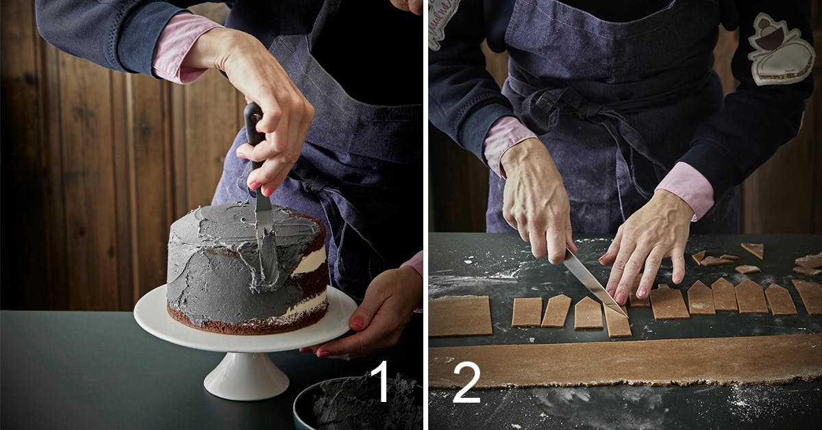 • ​Smørcreme til opsmøring: Gentag som ovenfor, men kom sort pulverfarve i smørblandingen, inden æggene tilsættes. Smør kagen sirligt op med den mørkegrå smørcreme.