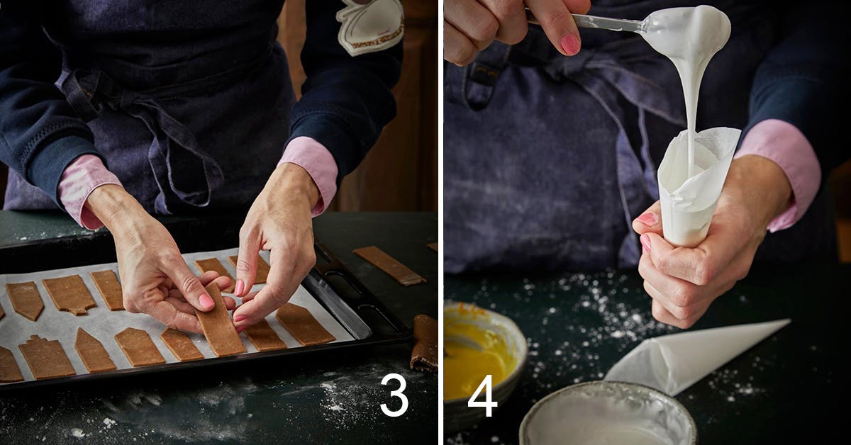 Trin 4: Glasur: Rør en luftig og sprøjtefast glasur af flormelis og æggehvide. Kom den i et kræmmerhus foldet af bagepapir, og klip et lille hul.
