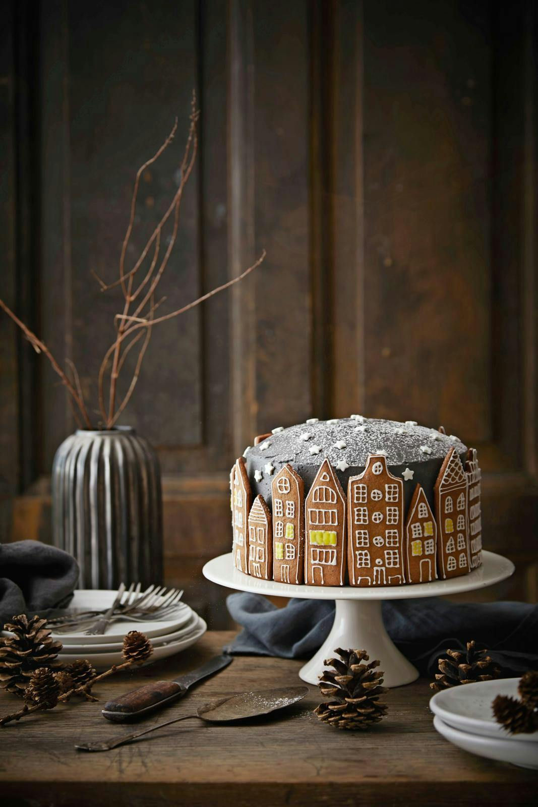 Servér denne overdådige honningkage pyntet med en hel by af peberkager, og vær sikker på, at dine gæster vil få julelys i øjnene. Kagen skal tilberedes over to dage, men den er noget nemmere at lave end et traditionelt honningkagehus. Og så emmer den altså af julestemning! Få vores guide her: