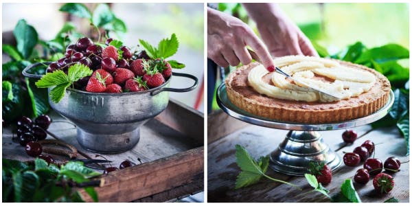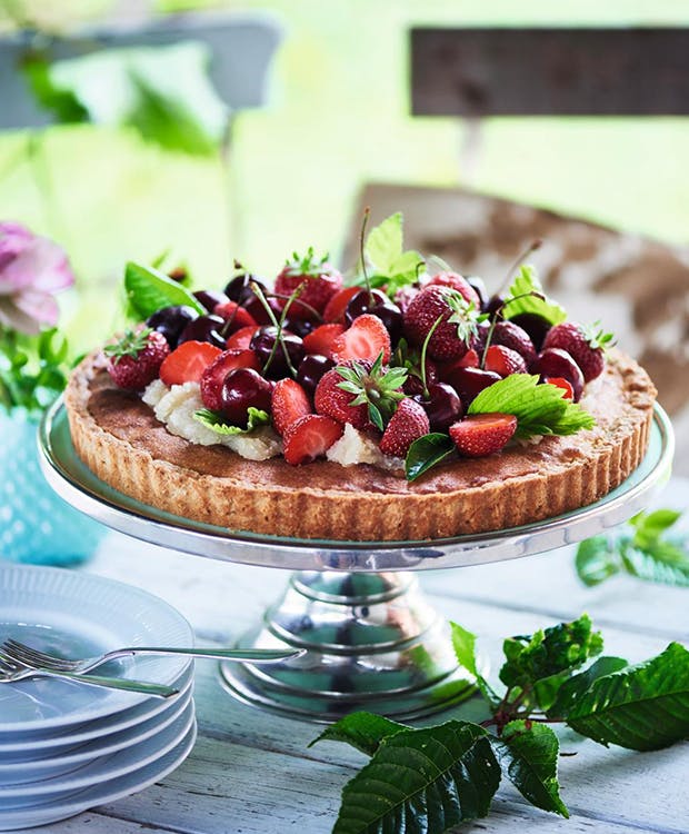 Her får du opskriften på en af vores absolutte sommerfavoritter; den skønneste tærte med marcipan, jordbær og kirsebær.