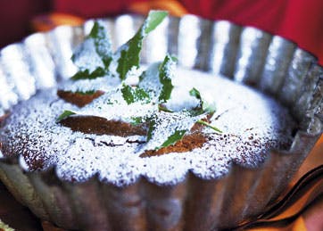 Kom dejen i kageformen, og bag kagen i en forvarmet ovn på 180° i ca. 45 min. Tjek, om kagen er færdigbagt, med en kødnål - hænger der ingen dej fast, er kagen gennembagt. Lad kagen afkøle i formen på en rist i ca. 15 min. Pynt kagen med kristtorn, og drys med fl ormelis. Server den evt. med cremefraiche og syltede vinterfrugter.