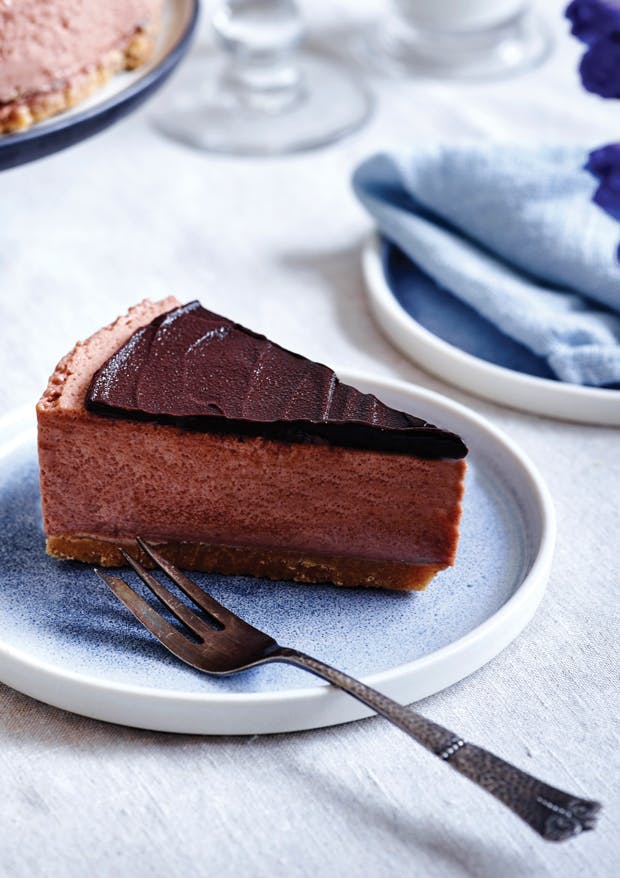 Hæld chokoladen over cheesecaken, og fordel den let med en paletkniv.