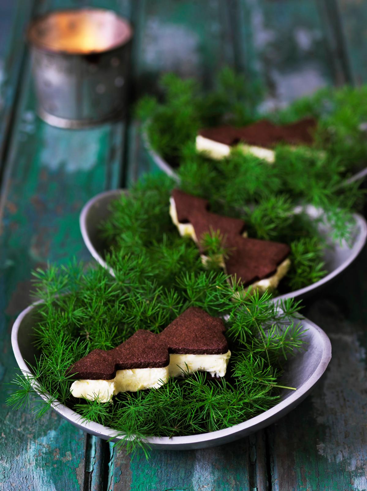 De små kakaojuletræer fyldt med cremet vaniljeparfait vil garanti pynte på tallerkenen. Servér dem på en bund af usprøjtet gran, så bliver desserten endnu mere eventyrlig!