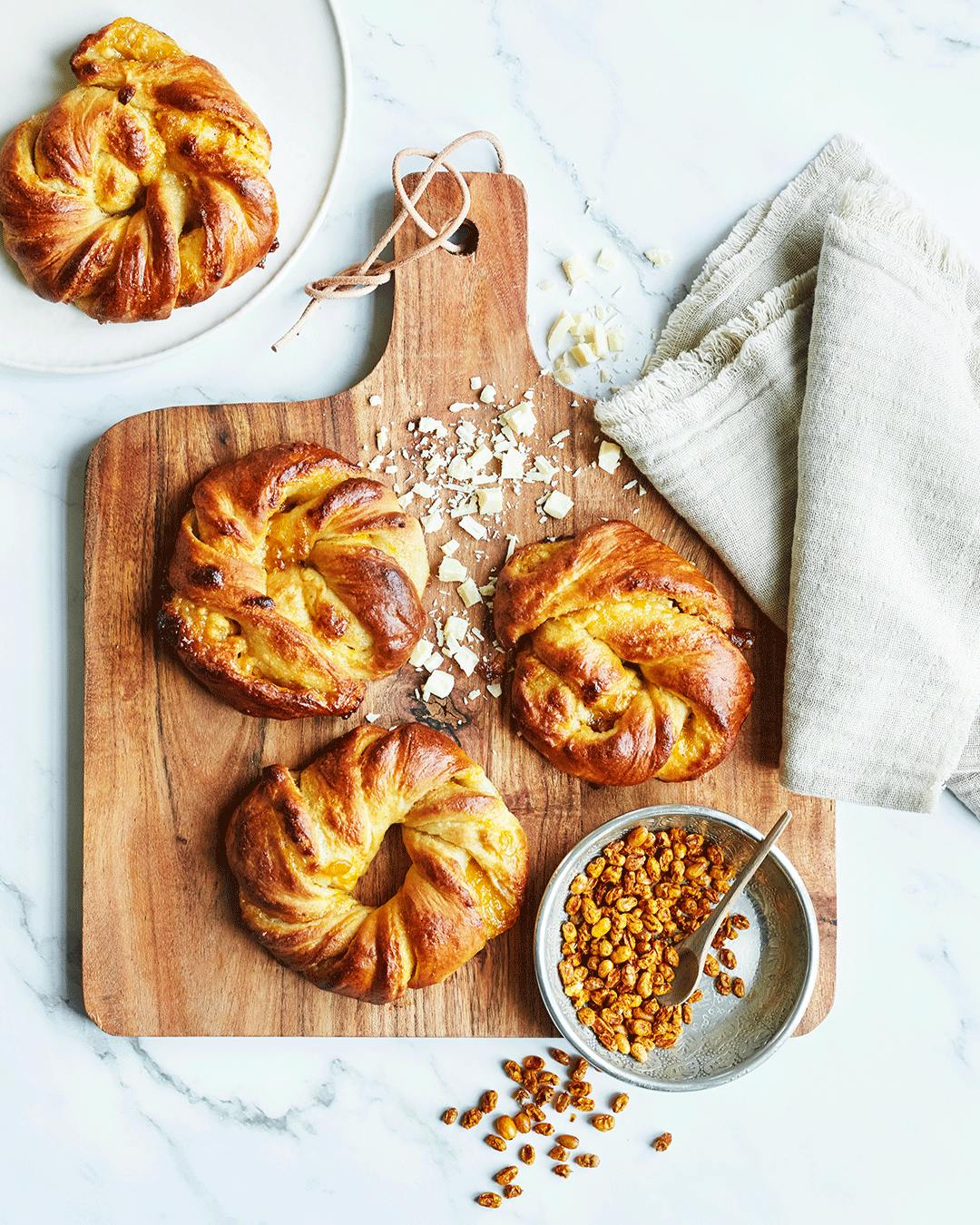 Fordel kransene på en bageplade med bagepapir, og pensl dem med sammenpisket æg. Lad kransene efterhæve i ca. 45 minutter til dobbelt størrelse.