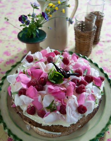 Pynt med rosenblade, hindbær, mynte og citronmelisse. Bind en lille knude på den brugte vaniljestang, og læg den på kagen som pynt.