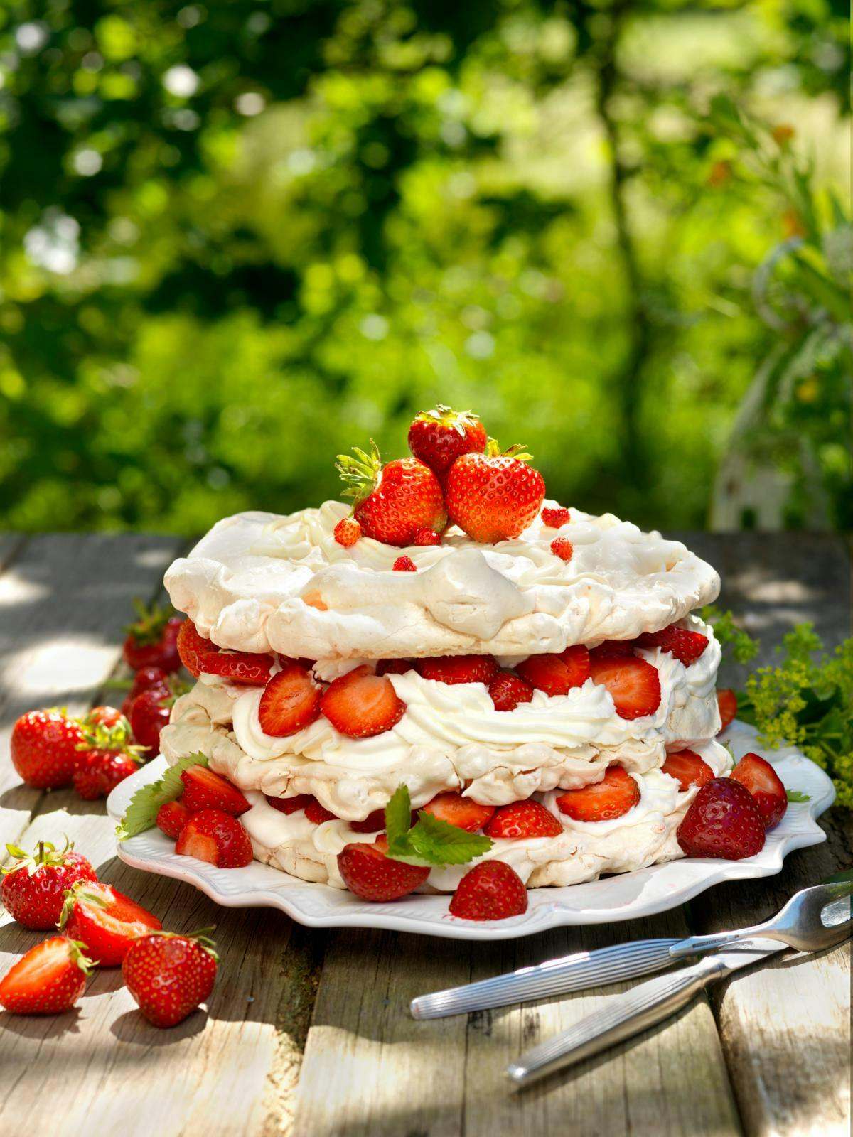 Denne marengslagkage med jordbær er perfekt til sommerens festligheder. Servér den for gæsterne på terrassen eller i udestuen, og nyd den søde forening af marengs og jordbær.