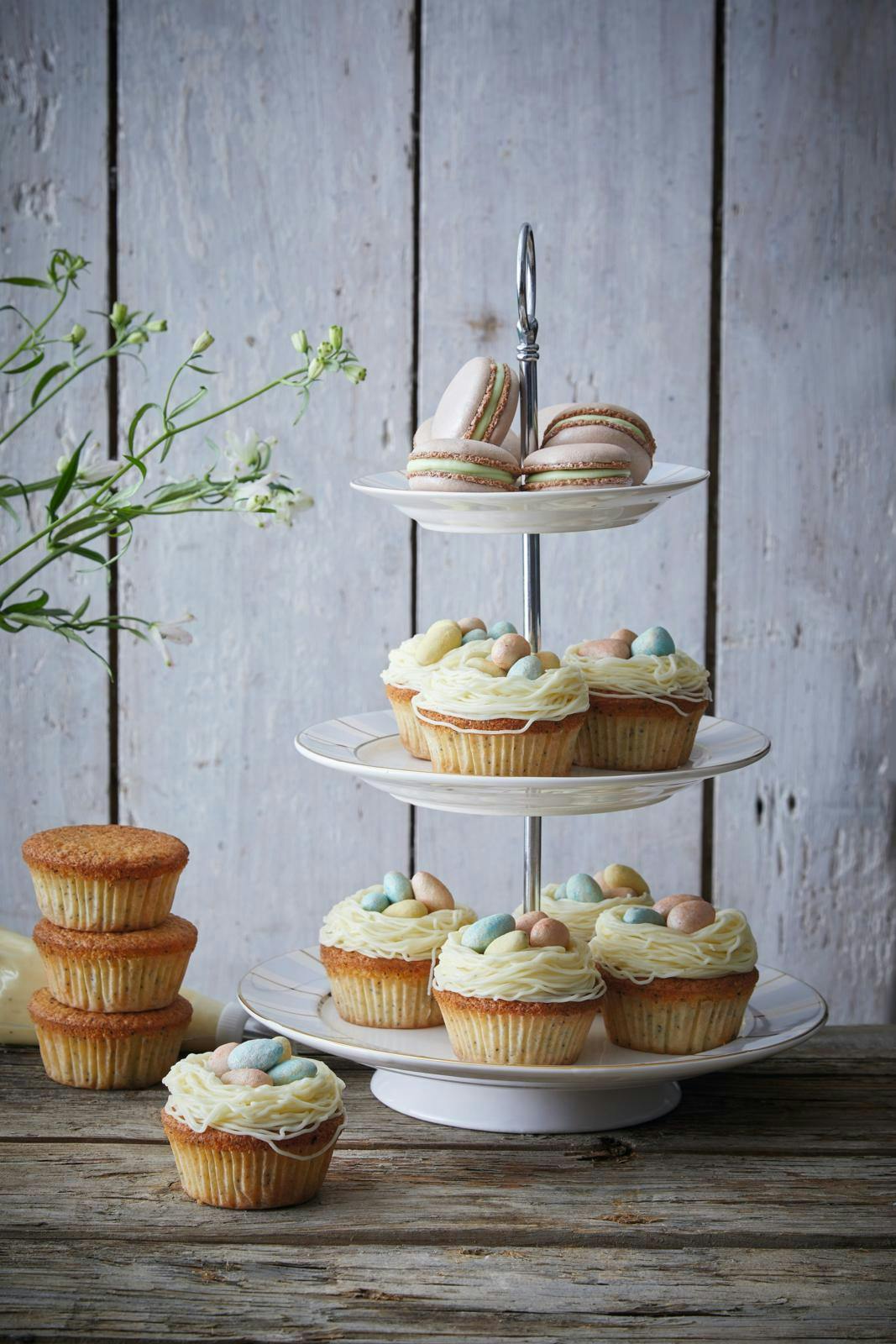 Afsæt rosetter af frosting som tilfældige, rodede fuglereder oven på kagerne.
