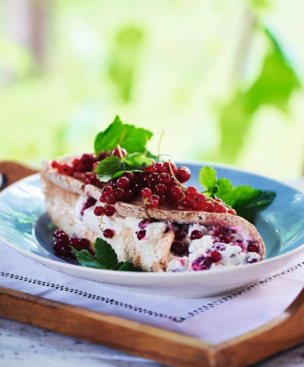 Vi har lavet en sensommersød roulade i pavlova-klæder og fyldt den med fløde og syrlige ribs. Her får du opskriften på den skønneste pavlova-roulade.