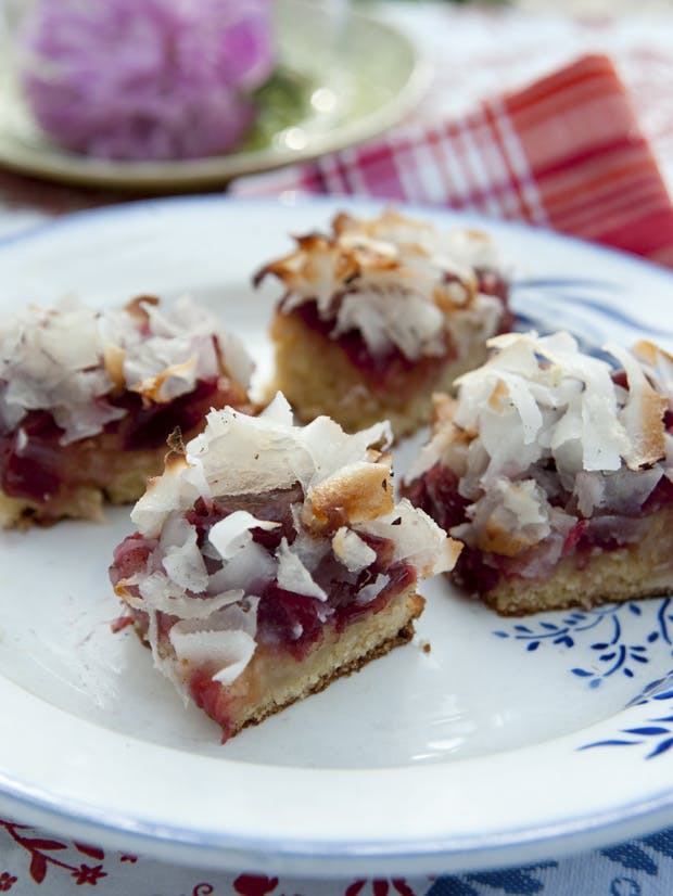 Lav en skøn rabarberkage, hvor dine rabarber får følgeskab af dejlig kokossmag både i kagedejen og som lækker topping.