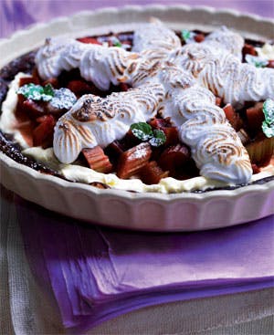 Fordel med en sprøjtepose marengsen over din rabarbertærte i et flot mønster. Flamber evt. marengsen med en gasbrænder, så den får en smuk gyldenbrun farve.
