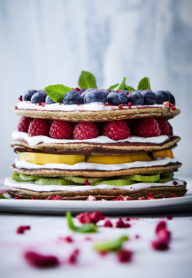 Farverigt, friskt og nærende. Dette lækre pandekagetårn er en både nem og sund dessert, der endda også kan serveres som en smuk og overdådig morgenmad. Den indeholder nemlig hverken smør, mel eller raffineret sukker, men derimod kun sunde og nærende ingredienser, der sagtens kan nydes til morgenmad.