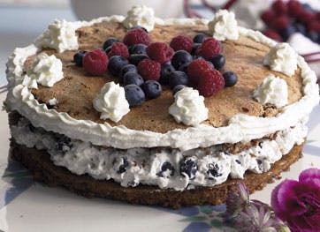 Pynt den færdige rugbrødslagkage med flødeskumsklatter og eventuelt ekstra bær.