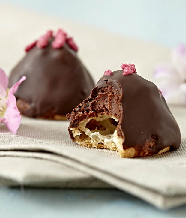 3. Smelt chokoladen over et vandbad. Tag kagerne ud af fryseren, og dyp eller pensl dem med chokoladen, drys med rosenblade, og stil kagerne køligt, til de skal spises.
