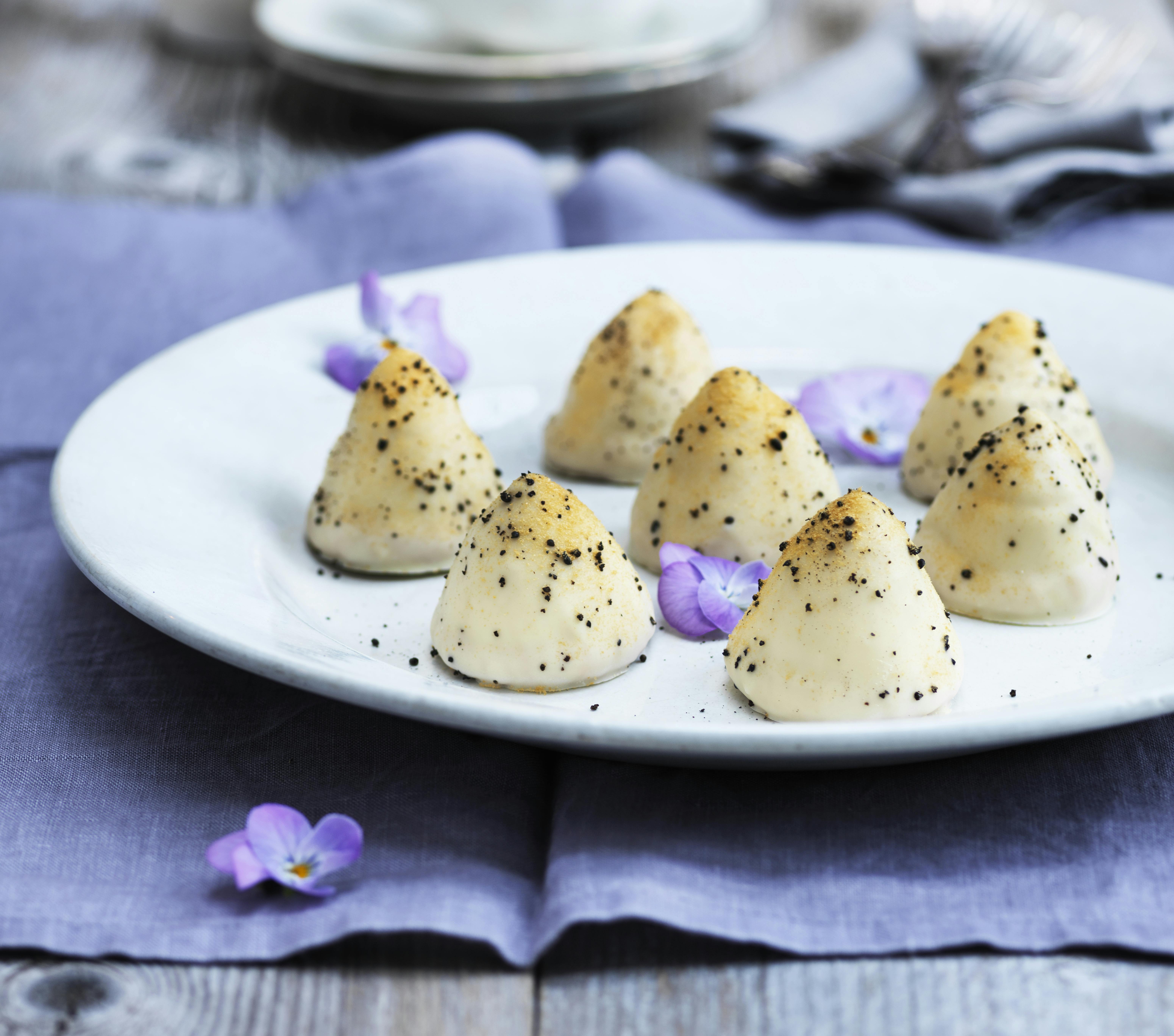 3. Pynt: Smelt chokoladen over vandbad, og betræk kagerne. Stil dem 1 ad gangen på en gaffel, og øs chokolade ud over med stor ske. Pynt med frysetørret passionsfrugt, lakridspulver og blomsterhoveder, og servér.