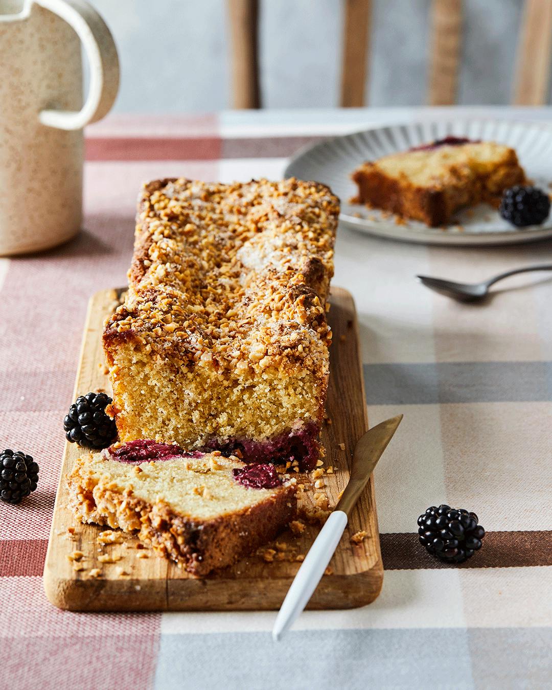 Rør forsigtigt brombærrene i dejen, og fordel dejen i en smurt form.