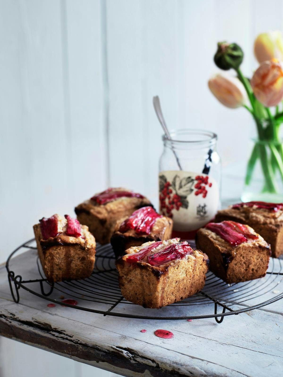 Afkøl kagerne helt på en bagerist. Servér med resten af rabarberne og lagen til.