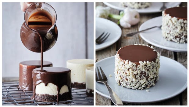 Lav de fineste chokoladekager med en saftig kagekrumme nederst, sød og syrlig cremet mousse i midten, overtrukket med den lækreste cremede chokoladeganache og pyntet med hvid chokolade - så behøver vi næsten ikke sige meget mere. Det er en kærlighedserklæring af en kage!