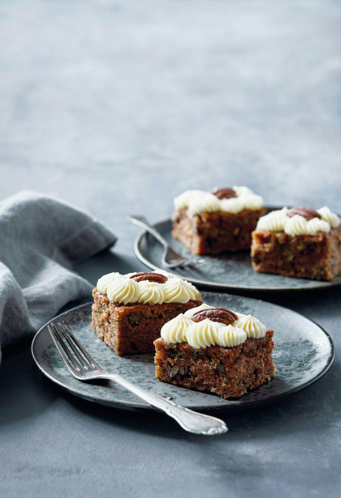 Skær kagen i 12 stykker, dekorér dem med frosting, og pynt med pekannødder.