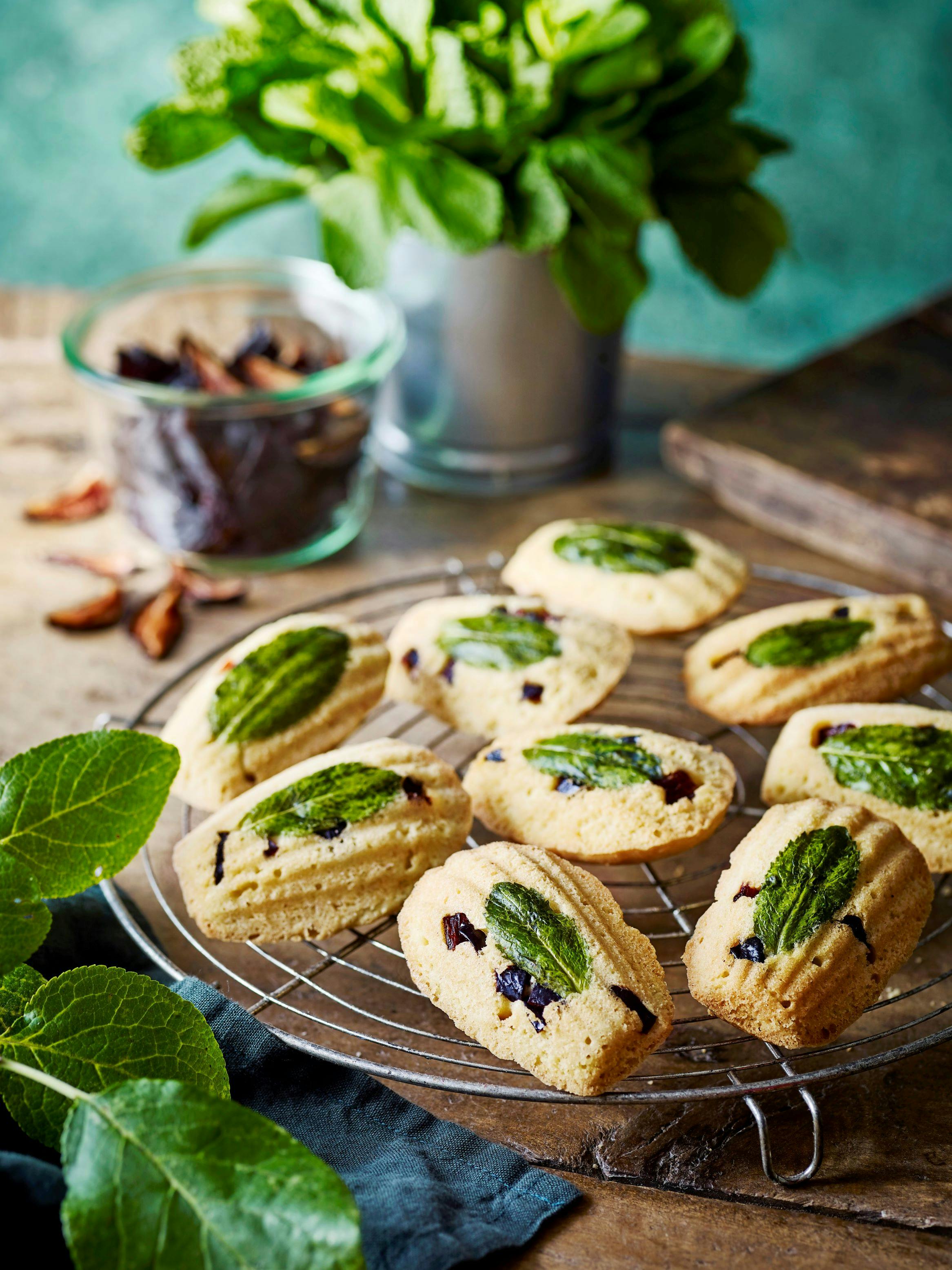 Smør 20 madeleineforme med smør, og læg 1 mynteblad i hver. Hæld dejen over.