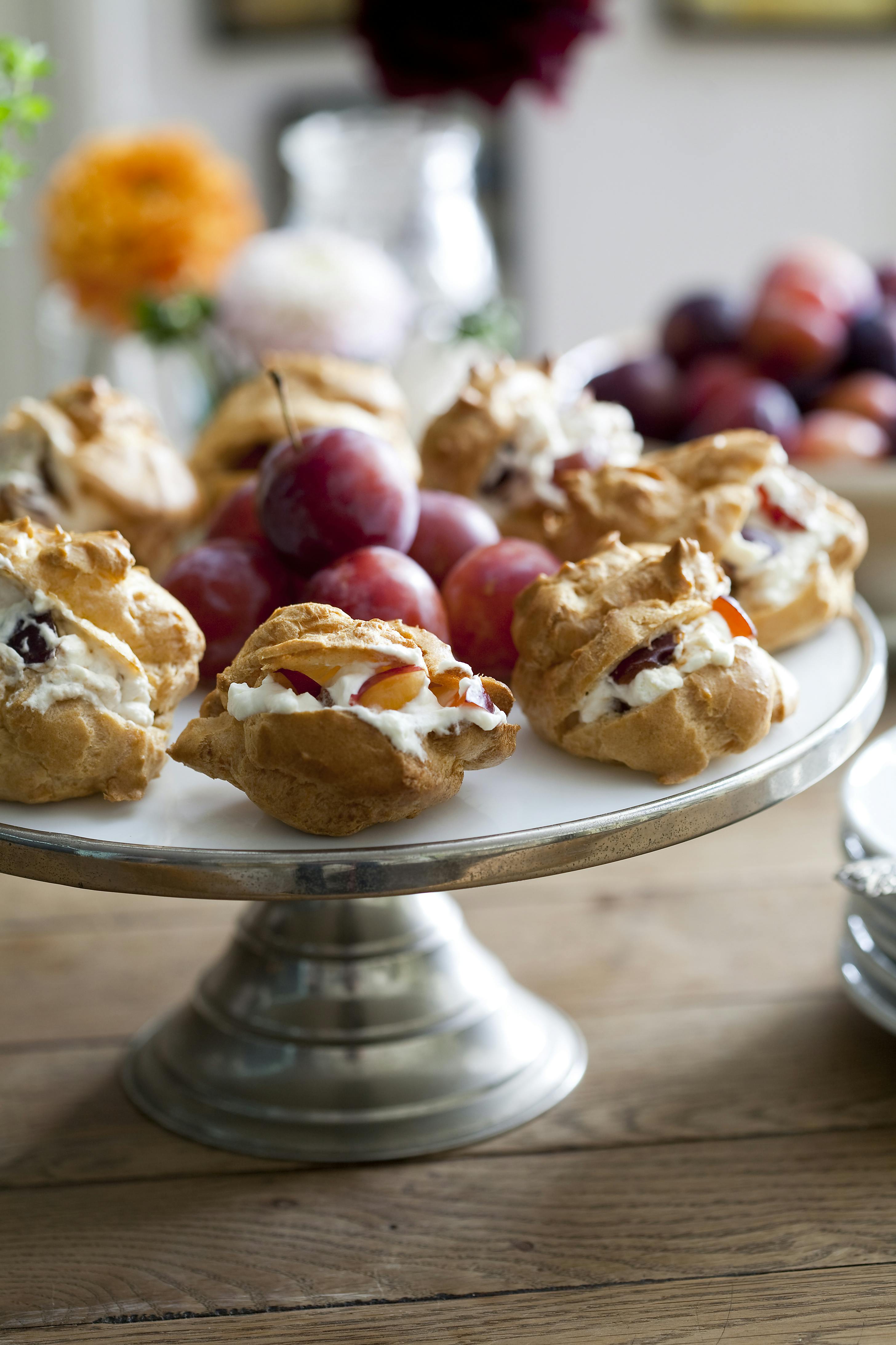 I stedet for blommer kan du fylde de luftige vandbakkelser med søde pærer eller friske bær.