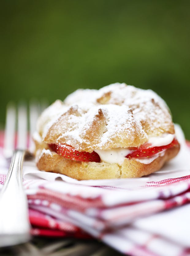 Lav en skøn creme af flødeskum og vanilje, og brug den sammen med søde jordbær i luftige vandbakkelser. Så får du en fantastisk sommerudgave af den klassiske kage, som er perfekt at sætte på kagebordet eller servere som del af en sommermenu.