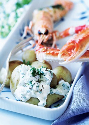 En sand sommerret: Jomfruhummer med ramsløg og nye kartofler med creme af rygeost