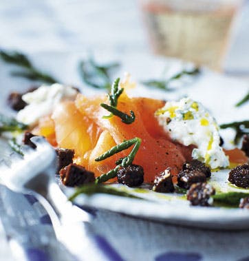 Skær laksen i tynde skiver eller få fiskehandleren til det. Fordel laksen på tallerkenerne. Læg en skefuld rygeost på hver tallerken. Dryp en halv spiseske citronolie på hver portion rygeost. Sæt en kasserolle over med letsaltet vand. Når vandet koger, tilsæt strandkveller og kog i 1 min. Hæld vandet fra og skyl med iskoldt vand. Fordel strandkveller på tallerkenerne og drys med rugbrødscroutoner.