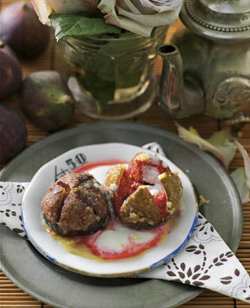Skær et kryds i hver figen, og læg dem i et ildfast fad. Rør smørret med rørsukkeret. Fordel smørret i fignerne. Bag fignerne i ovnen ved 200º i cirka 10 minutter. Rør yoghurt med cognac og flormelis. Ved anretning fordeles saften fra fignerne oven på yoghurten.