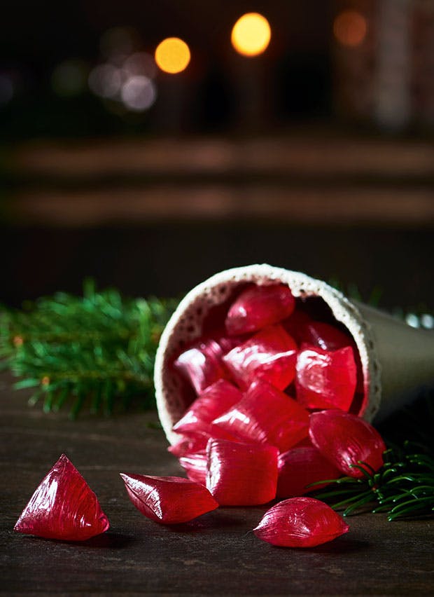 Vores bolsjer er kirsebærbolsjer, fordi de skal smage af jul. Men der er rigtig mange andre muligheder.