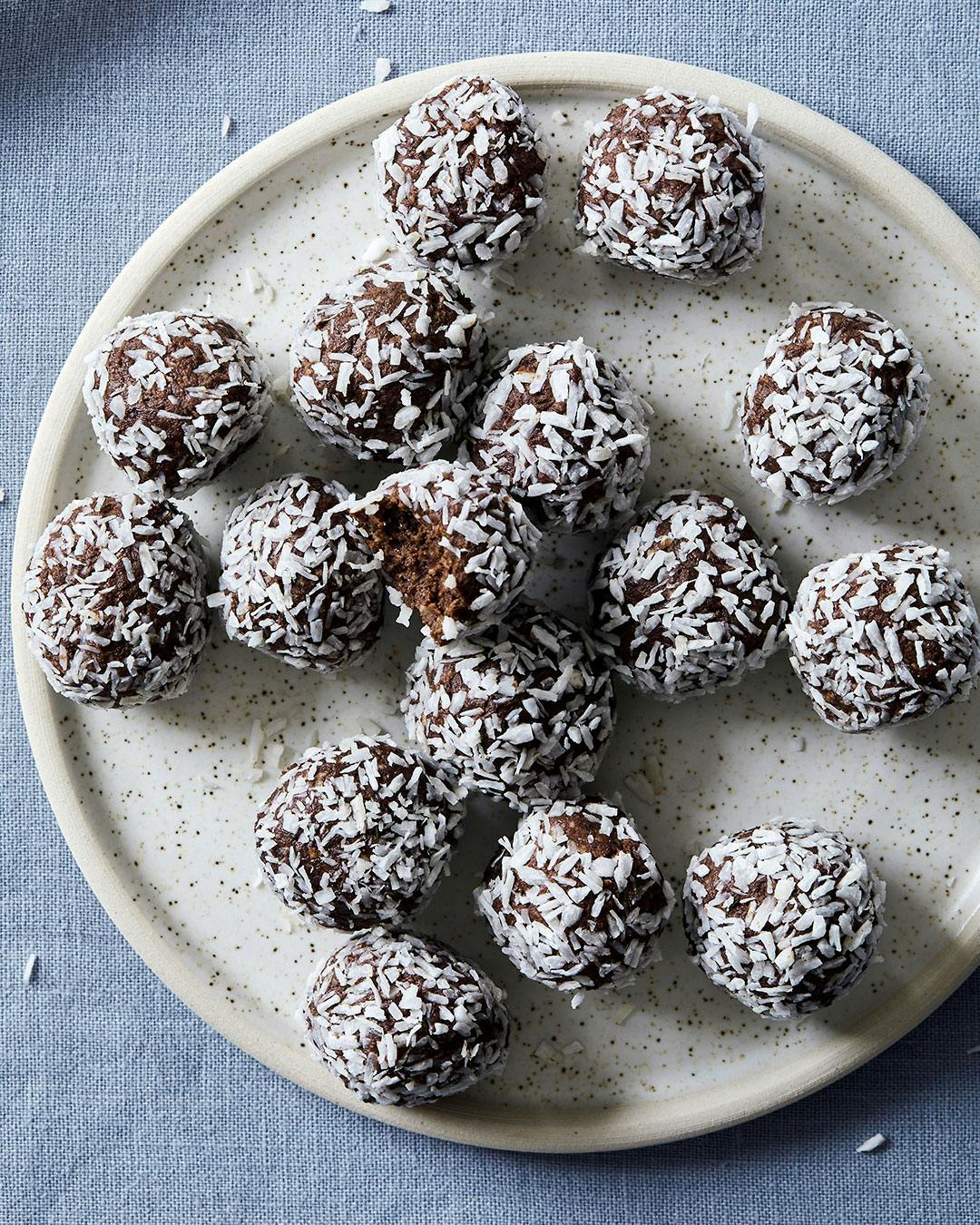 Form massen til lige store kugler. Tril kuglerne i kokosmel.