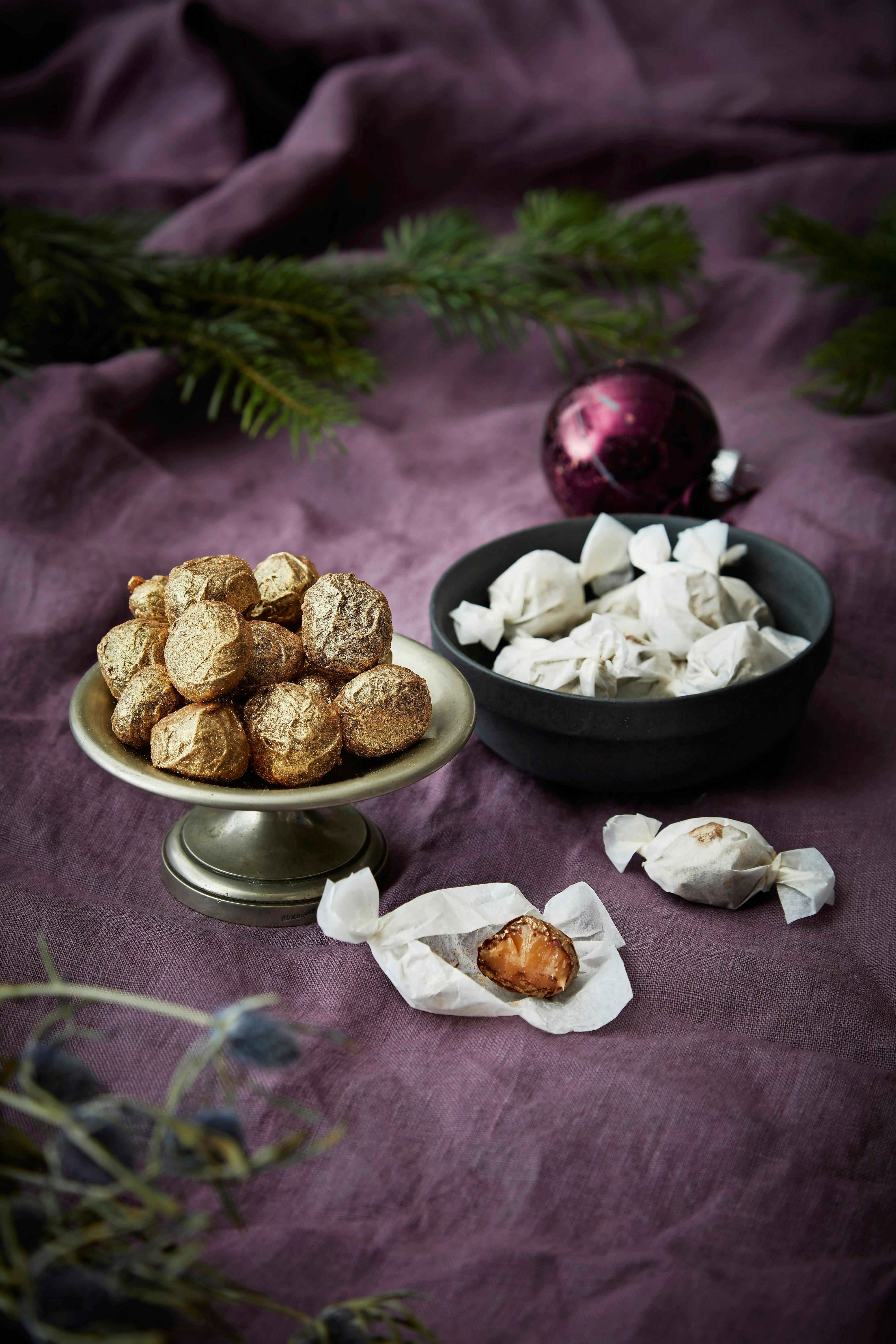 Del karamellen i ca. 25 mindre stykker, og form dem til bolde.