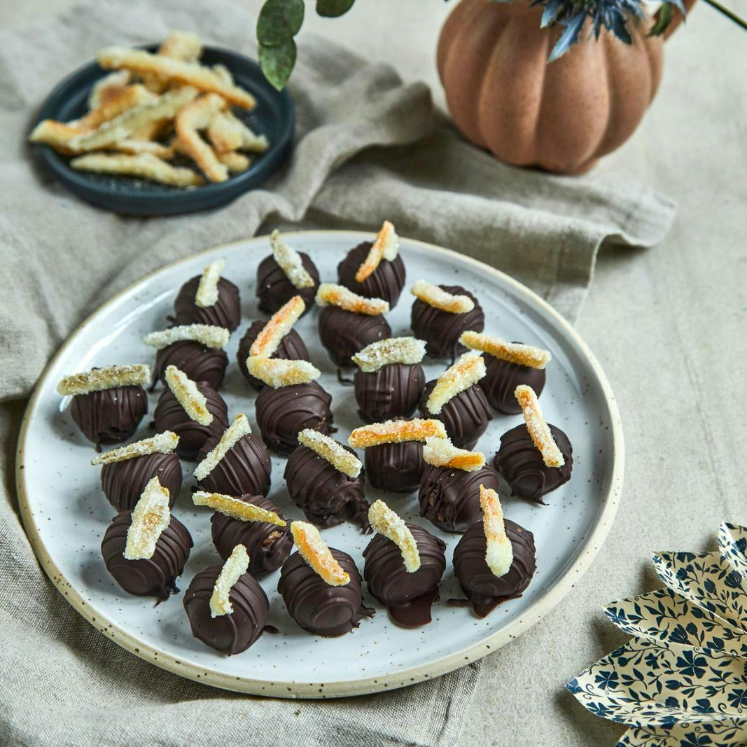 Bergamotte er en citrusfrugt med en vidunderlig, aromatisk skal, og den passer perfekt til disse chokoladeovertrukne marcipankugler - få opskriften her!