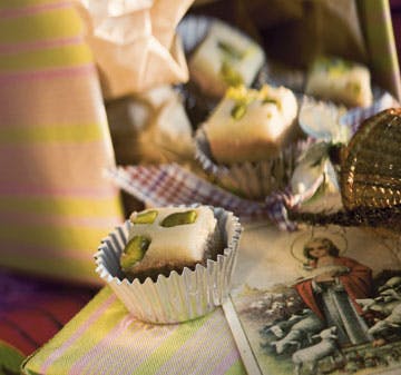 Læg et stykke bagepapir i et fad, og læg en plade marcipan på. Smør et lag nougat på marcipanen, og læg endnu en plade marcipan på. Gentag processen, og afslut med marcipanpladen med pistacienødder. Kom fadet i køleskabet i minimum 30 minutter. Skær konfekten ud i små kvadrater, og kom hvert stykke i en petitfourform.