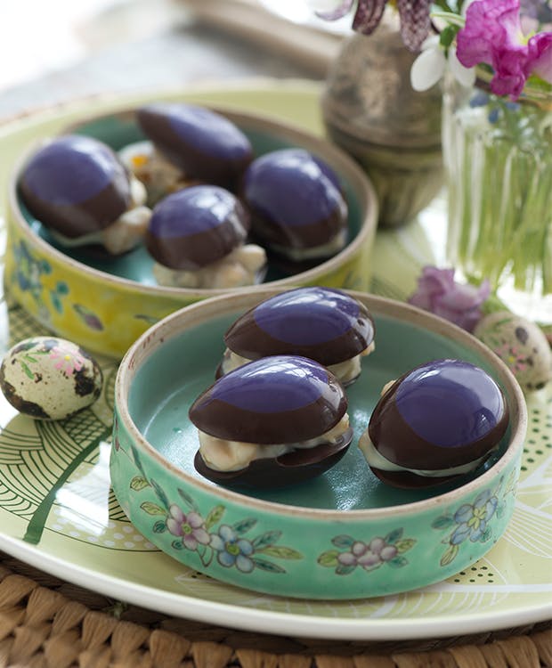 Skal du imponere dine påskegæster med noget sødt til ganen, er dette det helt rette projekt for dig! Opskriften er nem og hurtig - du skal bare sørge for at skaffe de rette forme til æggene og den lillafarvede chokolade. Så får du flotte æg, der simpelthen smager himmelsk med lækkert abrikosfyld, hvid chokolade og pistacienødder.