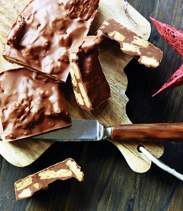 Kom små stykker kiks i og rør forsigtigt rundt. Hæld chokolademassen i en form, der er foret med bagepapir. Sæt på køl i to timer, og herefter kan du skære den ud i små chokoladestykker.