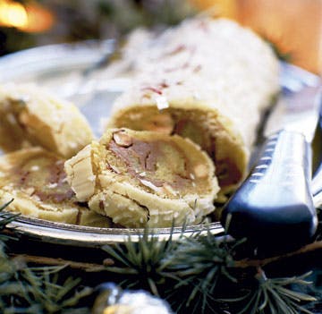 Læg den udrullede nougat oven på marcipanen. Hak hasselnødderne, og drys dem ud over nougaten. Rul det hele sammen til en roulade, så stramt som muligt. Smelt hvid chokolade over vandbad, og pensl rouladen med den. Drys med kokos og eventuelt lidt ekstra safran.