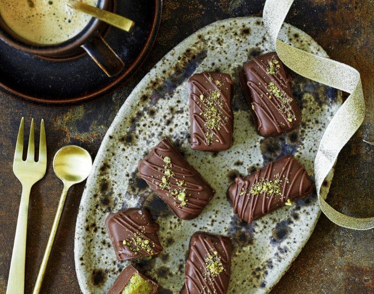 Friske, søde og let syrlige – de små pistaciestykker med lime og mælkechokolade er en elegant lillebid til kaffen eller som konfekt på julefadet.