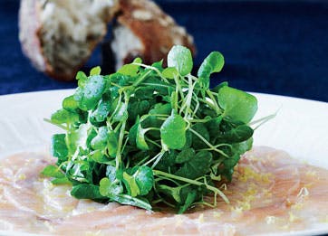 Skær laksen i ultratynde skiver, og læg dem på fire tallerkener. Fordel fintrevet citronskal og lidt citronsaft på (1-2 tsk.), sammen med en smule sukker og salt. Vend brøndkarse og rucola med olie og lime, og anret salaten på fisken. Servér med groft brød og smør.