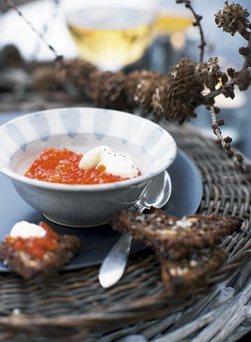 Rist rugbrødet og skær det i små firkanter. Læg en skefuld af citroncremen ved lakseæggene og server med rugbrød og ekstra citroncreme som tilbehør.