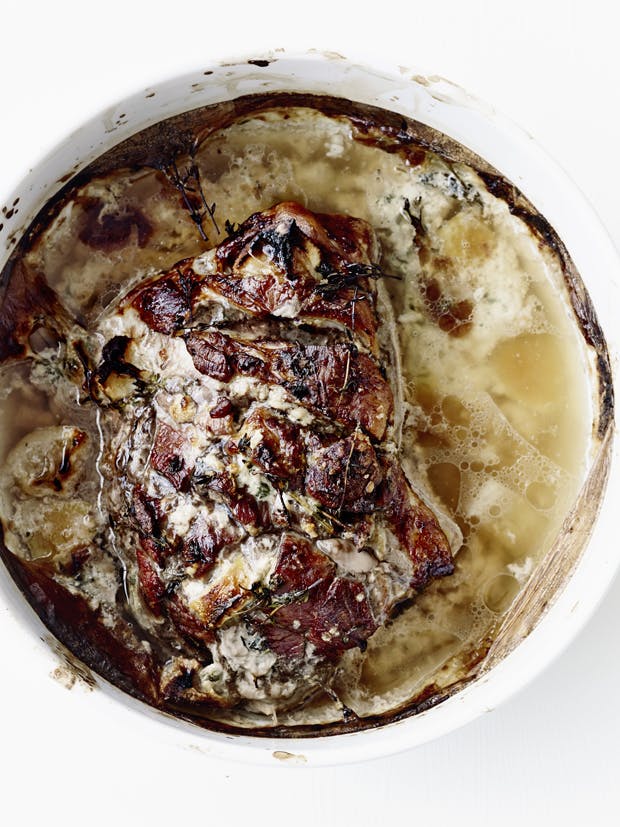 Langtidsstegt svinekød i stegeso med mælk, citron og timian