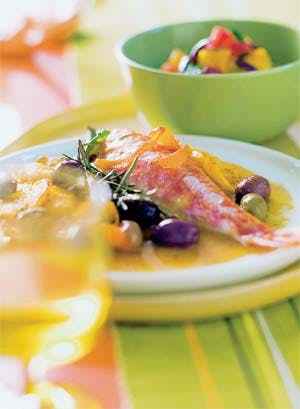 Skyl og rens mullerne. Skær to af appelsinerne i tynde skiver og pres saften af den tredje. Opvarm olivenolien forsigtigt i en sauterpande. Tilsæt appelsinskiver og -saft, oliven, laurbærblade og rosmarin. Brun det let. Læg fiskene i et ovnfast fad, hæld den varme olivenolie med appelsin, oliven, laurbærblade og rosmarin over. Stil fadet i en 210° varm ovn i 15 min. Server retten varm f.eks.
