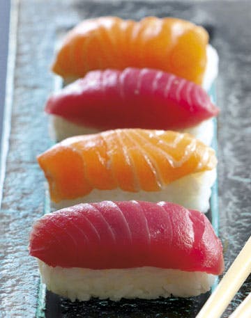 Skyl risene indtil vandet forbliver klart. Kom ris og vand i en gryde med tætsluttende låg. Bring vandet i kog og lad det koge ved middel varme i ca. 12 min. Lad risene trække i 10 min. under låg. Afkøl risene i en stor skål. Rør forsigtigt rundt i risene med en træspatel. Tilsæt sushi-zu og rør rundt. Skær laks og tun i tynde, aflange skiver på skrå. Fordel en smule wasabi på stykket. Form en klump ris på størrelse med en bordtennisbold til en afl ang bolle med afrundede ender. Læg fiskestykket oven på risklumpen med wasabien nedad. Server syltet ingefær, wasabi og soja til.