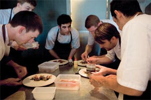 Vi besøger stedet en rygende travl aften. Restauranten er fuldt besat, og blandt gæsterne er to af Europas fremmeste madanmeldere, hvoraf den ene, fra Spanien, har afsat halvanden time til måltidets lange strøm af retter. Samarbejdet kører som smurt ude i køkkenet, hvor et mylder af kokke kreerer haute couture-retter for fuldt tryk under ledelse af René Redzepi.