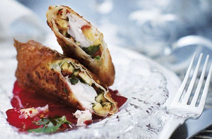 Rul filodejen ud. Tag et ark og pensl det med rapsolie. Læg et ark mere ovenpå. Klip arket i fire stykker. Læg et stykke torsk lidt inde på hver firkant. Drys æbleblandingen ovenpå. Fold enderne ind og rul filodejen stramt om fisken, til det er som en tyk cigar. Gentag til du har otte styk.
